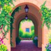 The high-quality linen canvas measures 16×20 inches, providing ample space for detailed tropical and architectural elements. This size displays beautifully in any room setting.
