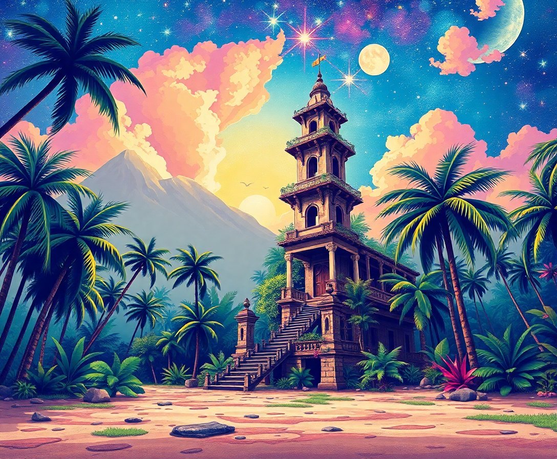 Ultimately, add final details to your celestial tower using the finest brush for precise highlights. Additionally, step back periodically to appreciate your emerging masterpiece. Finally, celebrate your artistic achievement as tropical paradise meets ancient mystery.