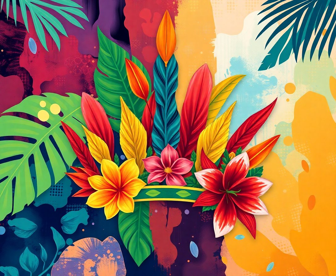 Ultimately, step back and admire your finished creation. The tropical crown emerges through layers of green foliage and abstract elements. Your artistic achievement deserves prominent display.
