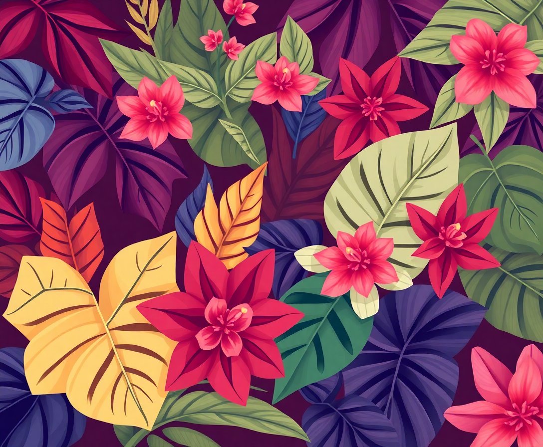 Ultimately, add the final tropical foliage details to complete your masterpiece. Step back and admire how the rich cabernet hues complement the vibrant greenery, creating a sophisticated focal point for any room.
