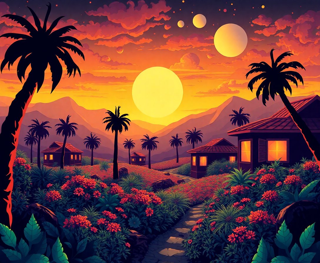 The unique combination of tropical plantation and alien elements creates a one-of-a-kind artwork. Golden hour lighting adds warmth and depth to this retro-futuristic masterpiece.