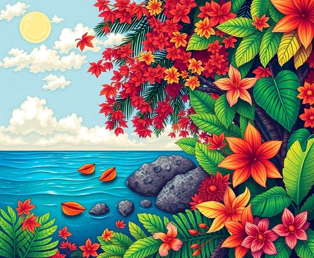 Ultimately, step back and admire your completed tropical harvest scene. Therefore, the vibrant hibiscus flowers complement the autumn bounty beautifully. Your finished artwork captures both tropical aesthetics and thanksgiving warmth perfectly.