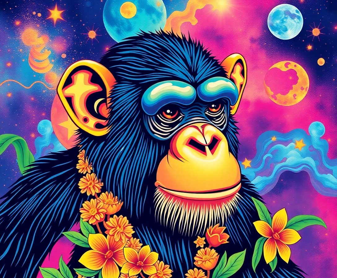 Transform your space with this extraordinary Myth & Magic creation. The Aloha Shirt Cosmic Chimpanzee Paint By Numbers blends tropical vibes with galactic wonder. This unique design features a charismatic ape sporting vibrant floral patterns against a stunning cosmic backdrop.