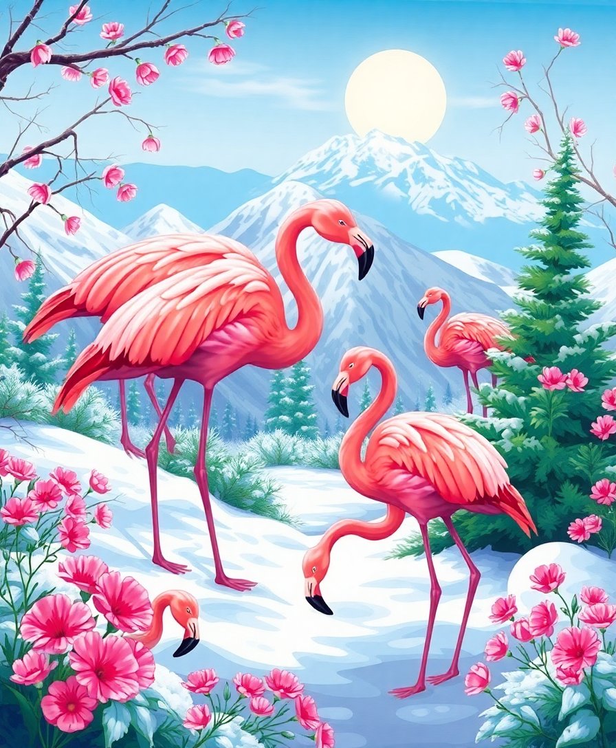 Transform your living space with the enchanting Alpine Spring Flamingo Haven Paint By Numbers, where tropical elegance meets winter wonderland beauty. This stunning artwork captures majestic flamingos nestled in a snowy alpine landscape, creating an extraordinary visual contrast that captivates viewers.
