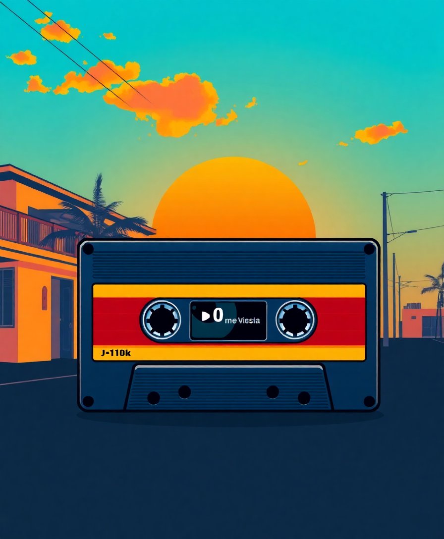 This artwork celebrates vintage cassette culture with warm sunset tones that evoke nostalgic memories. Perfect for anyone who appreciates retro music aesthetics and nineties pop culture.