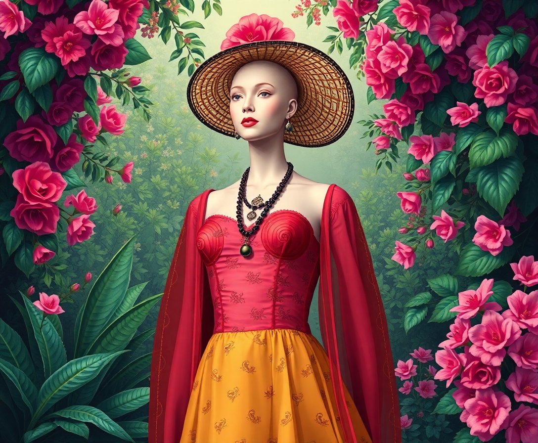 Ultimately, step back and admire your completed masterpiece. The vintage mannequin emerges beautifully against lush botanical surroundings. Display your finished artwork proudly in any room seeking elegant, nostalgic charm.
