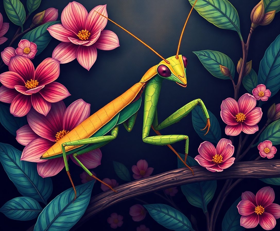 Embrace the timeless elegance of vintage scientific illustration. Start your artistic journey with this captivating mantis botanical study today.