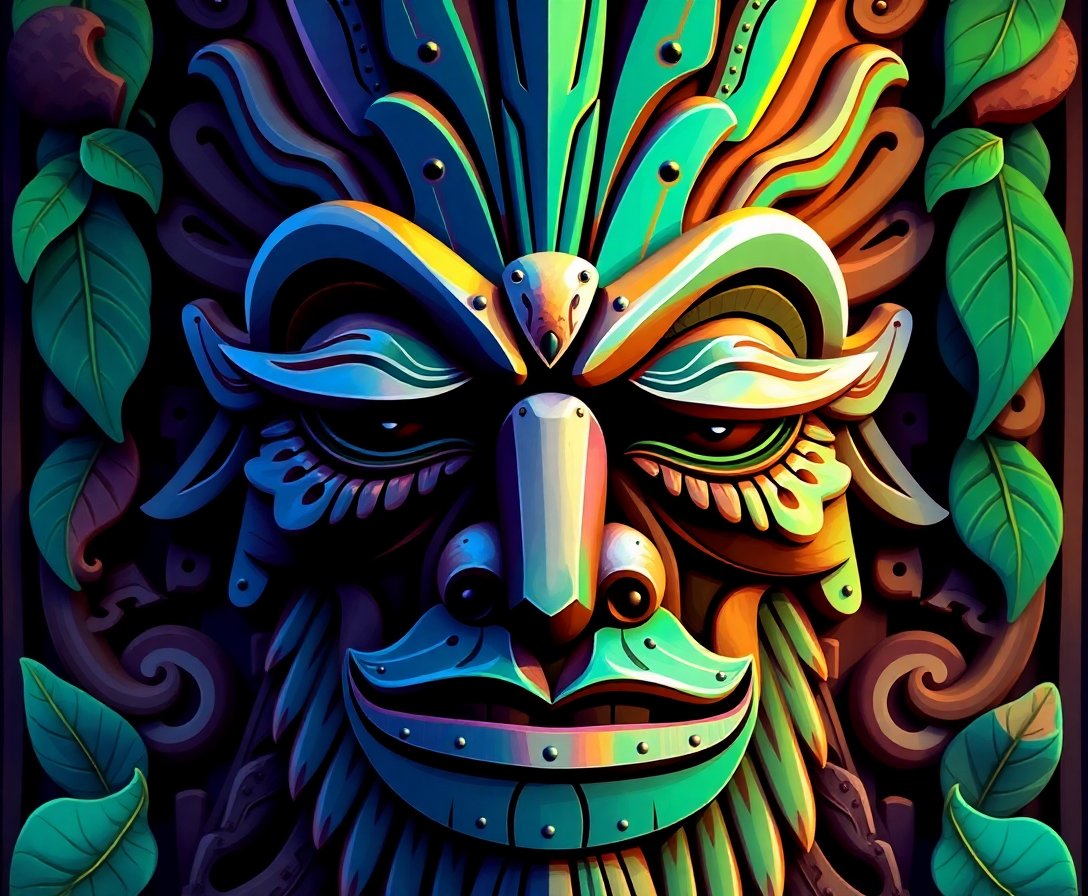 This design celebrates authentic Polynesian artistic traditions through detailed representation of carved ceremonial masks. The realistic weathered textures and historical accuracy make it both educational and beautiful.