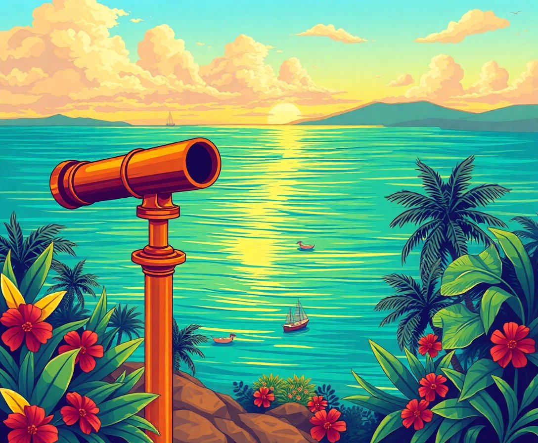 Ultimately, step back and admire your finished maritime masterpiece. The vintage spyglass now captures an eternal tropical horizon. Your completed artwork celebrates the golden age of maritime exploration beautifully.