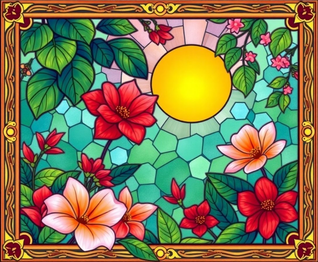 Ultimately, add finishing touches to the delicate heliconia petals and stained glass borders. Step back and admire your completed masterpiece as morning light seems to dance across the canvas.