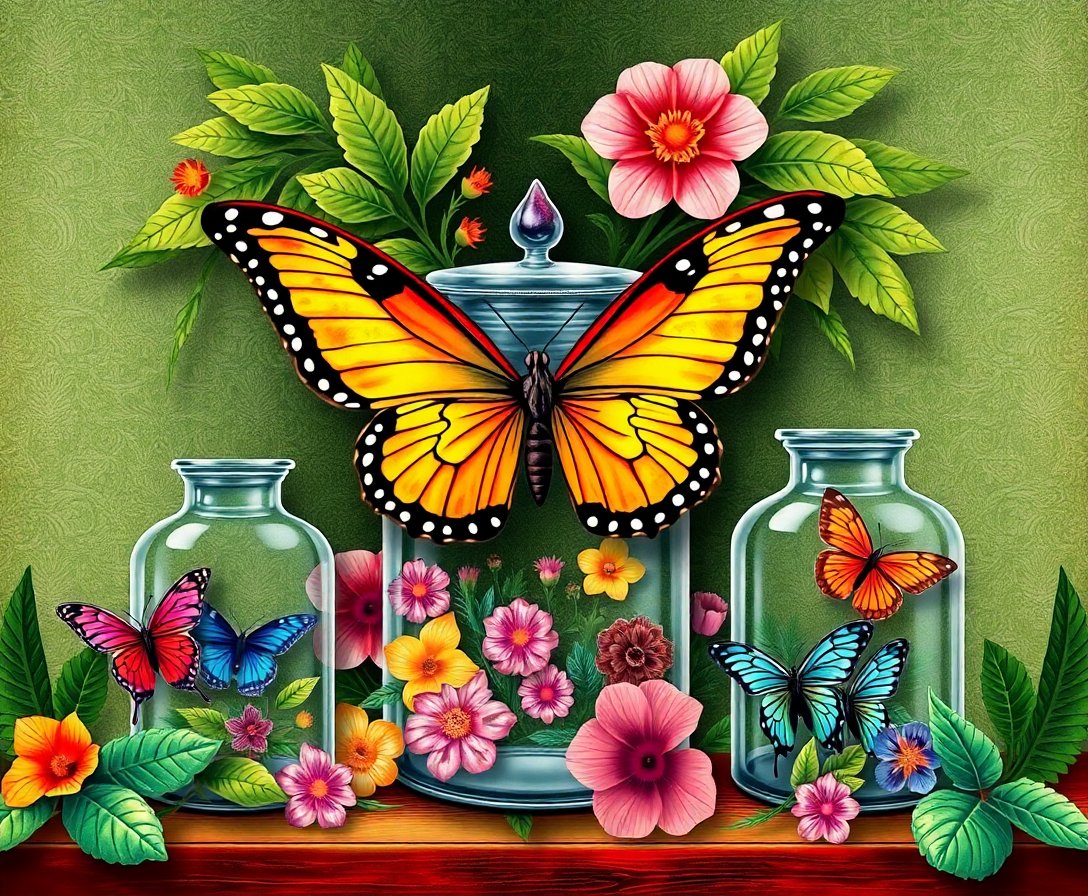 Ultimately, step back and admire your completed masterpiece. Moreover, the antique jars and tropical wings create a mesmerizing display. Finally, use the hanging kit to showcase your artistic achievement.
