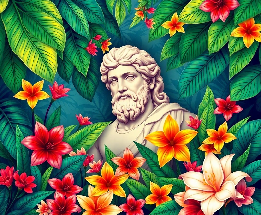 This unique design combines classical Apollo sculpture with tropical botanical elements, creating a distinctive vintage aesthetic. The patina effects and cultural details offer an educational artistic experience.