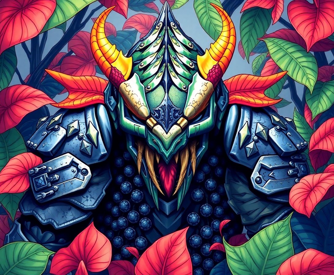 The unique combination of mythical armor and realistic monstera vines creates a captivating contrast. The detailed rust textures and vibrant green palette offer an engaging painting experience with stunning visual results.