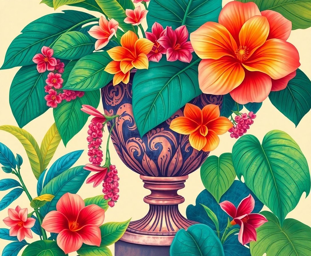 Ultimately, apply final touches to enhance the tropical urn’s brass highlights. Consequently, your completed artwork showcases intricate botanical details with professional quality. The finished piece radiates sophisticated elegance.
