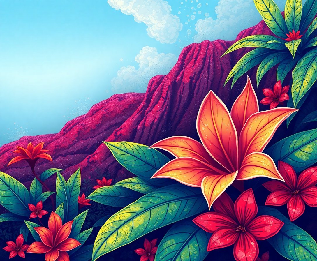 The unique volcanic ash backdrop creates dramatic contrast against vibrant orange blooms. This realistic flora composition celebrates nature’s resilience in challenging environments beautifully.