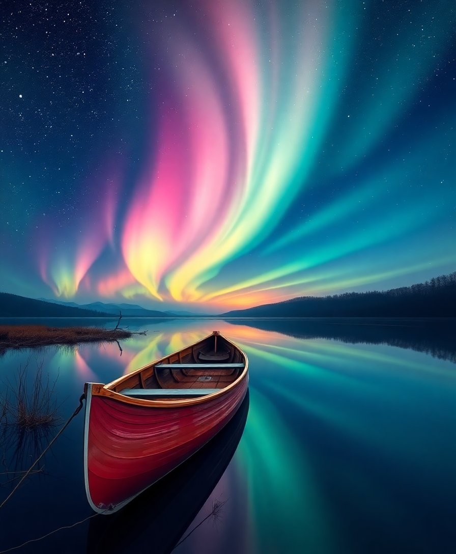 Ultimately, add final details to the vintage canoe and water reflections. Additionally, step back to admire your completed northern lights scene. Your finished artwork radiates the mystical beauty of midnight aurora magic.