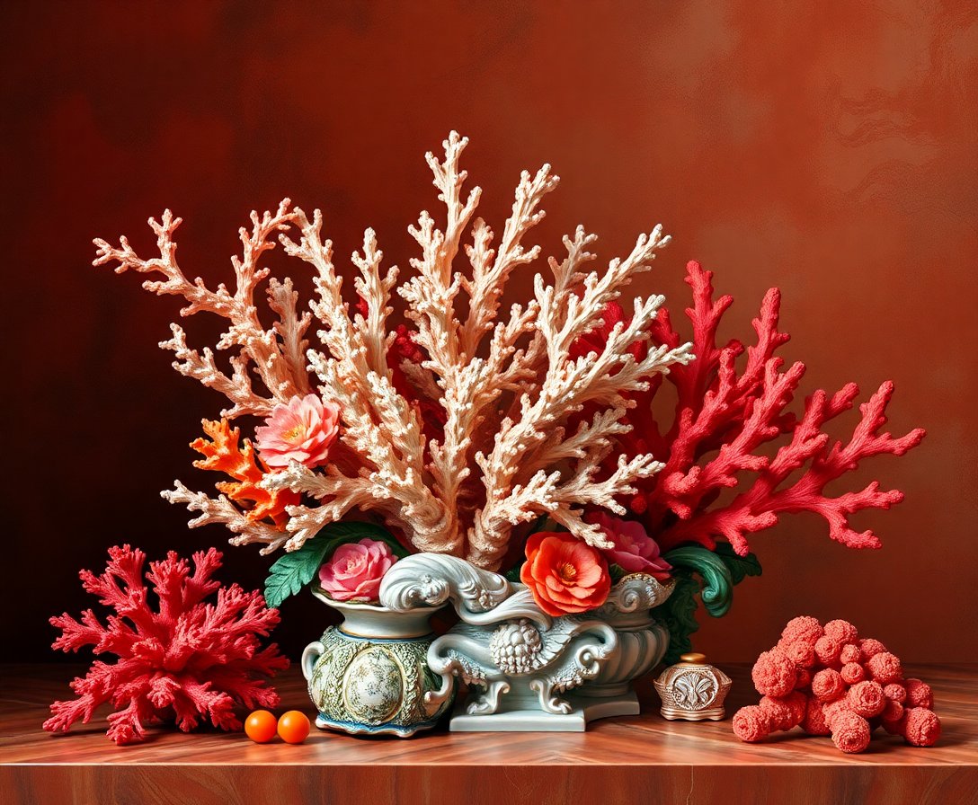This design features authentic chiaroscuro lighting techniques and rich crimson-coral color palette characteristic of classical Baroque still life paintings. The realistic details create museum-quality results.