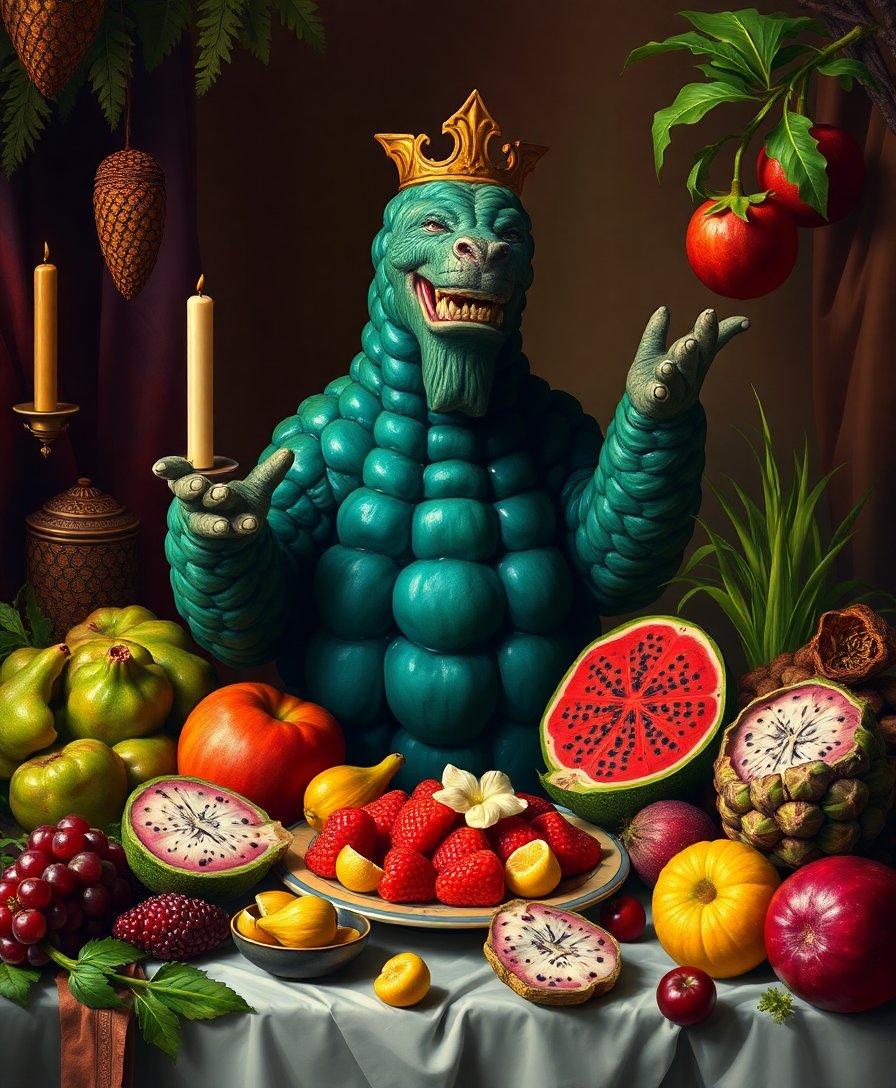This unique composition combines classical chiaroscuro techniques with exotic tropical elements like pitaya fruits and goliath beetles. The result is a sophisticated artwork that bridges traditional and contemporary themes beautifully.