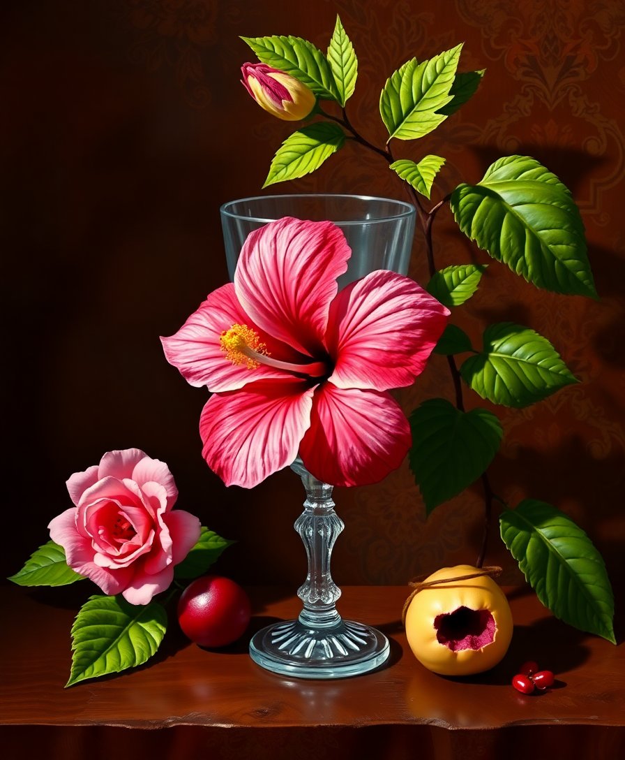 Ultimately, complete the final highlights on the hibiscus petals and glassware reflections. Step back to admire your finished masterpiece. The dramatic interplay of light and shadow creates a truly captivating baroque-inspired artwork.