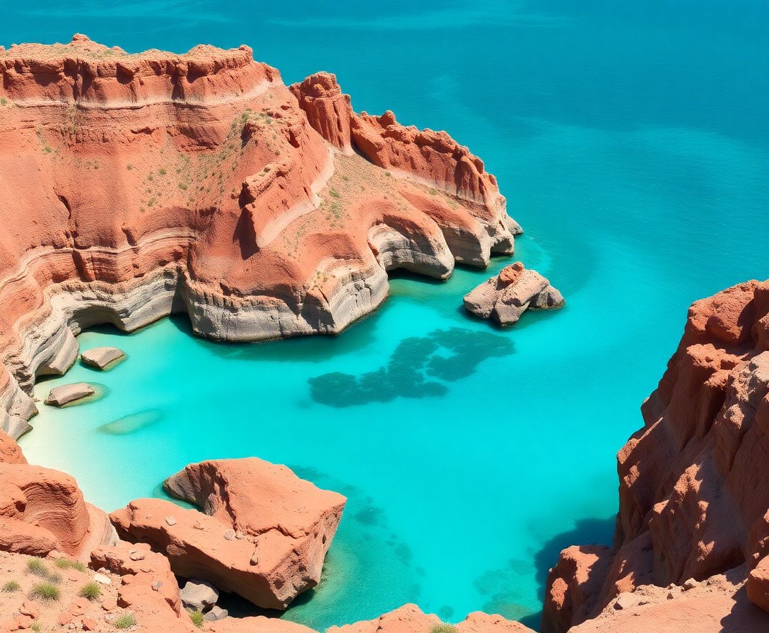 The dramatic contrast between dark basalt rocks and brilliant turquoise waters creates a stunning visual impact. This realistic coastal scene captures the unique beauty of volcanic shorelines.