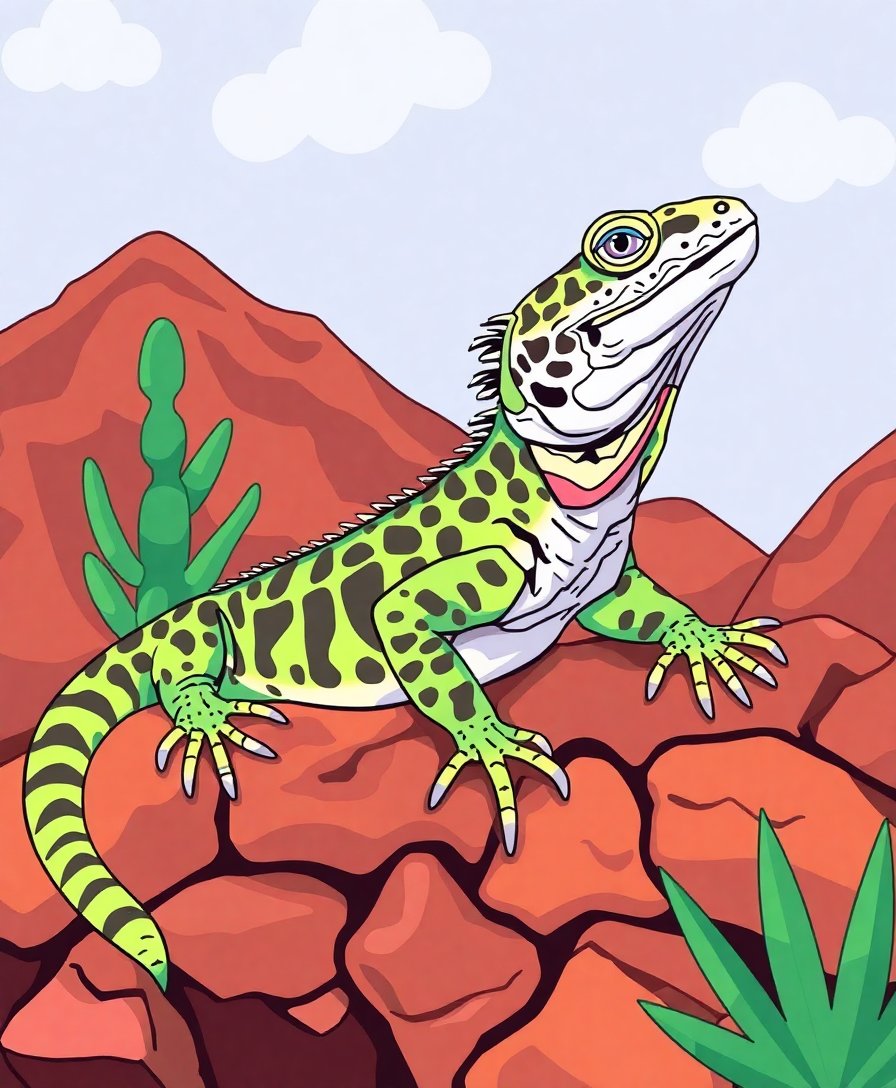 Ultimately, step back and admire your completed masterpiece. Add final touches and details to enhance the sunlit boulder setting. Your finished artwork showcases the exotic beauty of this basking reptile in stunning detail.