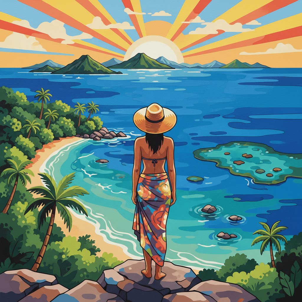 Transform your creative space with this stunning Bather Overlooking Tropical Waters Paint By Numbers masterpiece. This captivating design captures a peaceful moment of relaxation overlooking pristine turquoise waters. Moreover, the tropical scenery creates an instant escape to paradise through art.