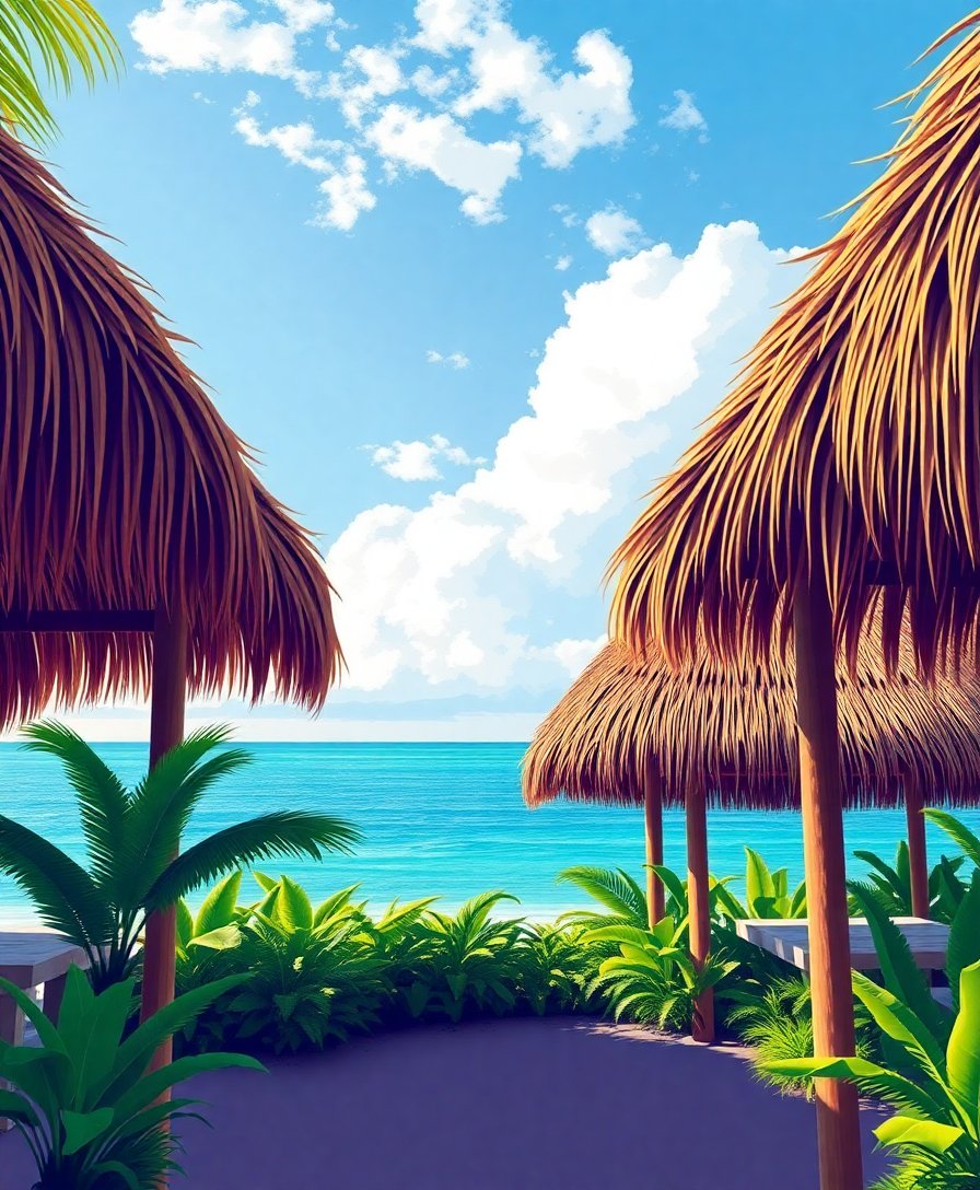 Transform your space into a tropical paradise with this captivating Beneath Tropical Thatched Roofs Paint By Numbers masterpiece. Experience the serene beauty of island life as you recreate stunning beachfront cabanas surrounded by lush greenery and golden sunshine.