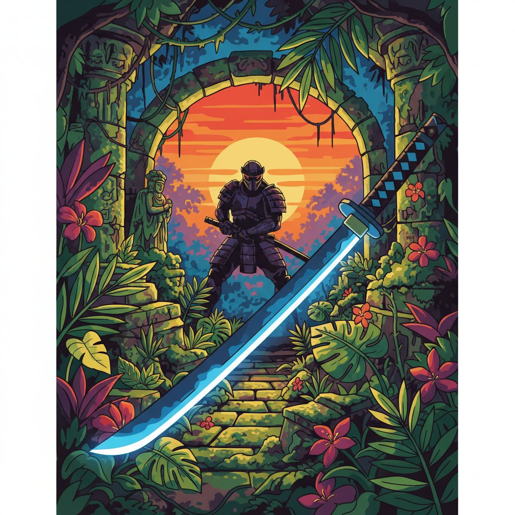 Transform your creative space with this captivating Blade Through Tropical Ruins Paint By Numbers design. This adventure-themed artwork combines lush tropical elements with mysterious overgrown ruins, creating a masterpiece that celebrates golden era comics aesthetics.
