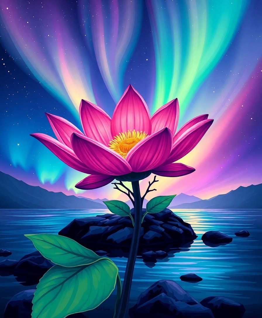 Ultimately, step back and admire your finished masterpiece radiating with aurora effects. The glowing tropical flowers against the starlit sky create a stunning focal point. Your completed artwork deserves prominent display in your favorite space.