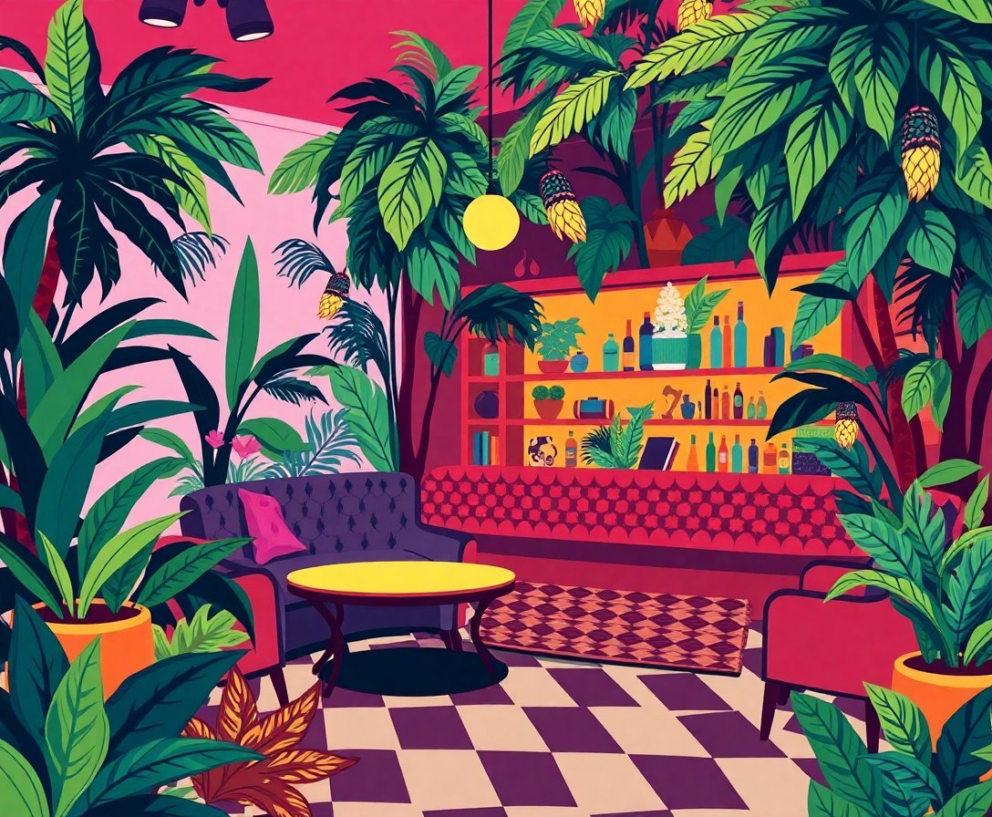 The tropical jungle lounge theme combines nostalgic elements with sophisticated artistic composition. The gramophone and cinematic atmosphere create a unique vintage aesthetic perfect for any room.