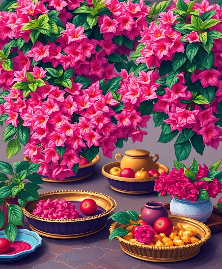 Transform your space with the vibrant beauty of the Bougainvillea Over Tropical Trays Paint By Numbers kit. This stunning artwork captures the exotic charm of tropical marketplaces. Furthermore, magenta blooms cascade over ornate metallic trays in this opulent design.