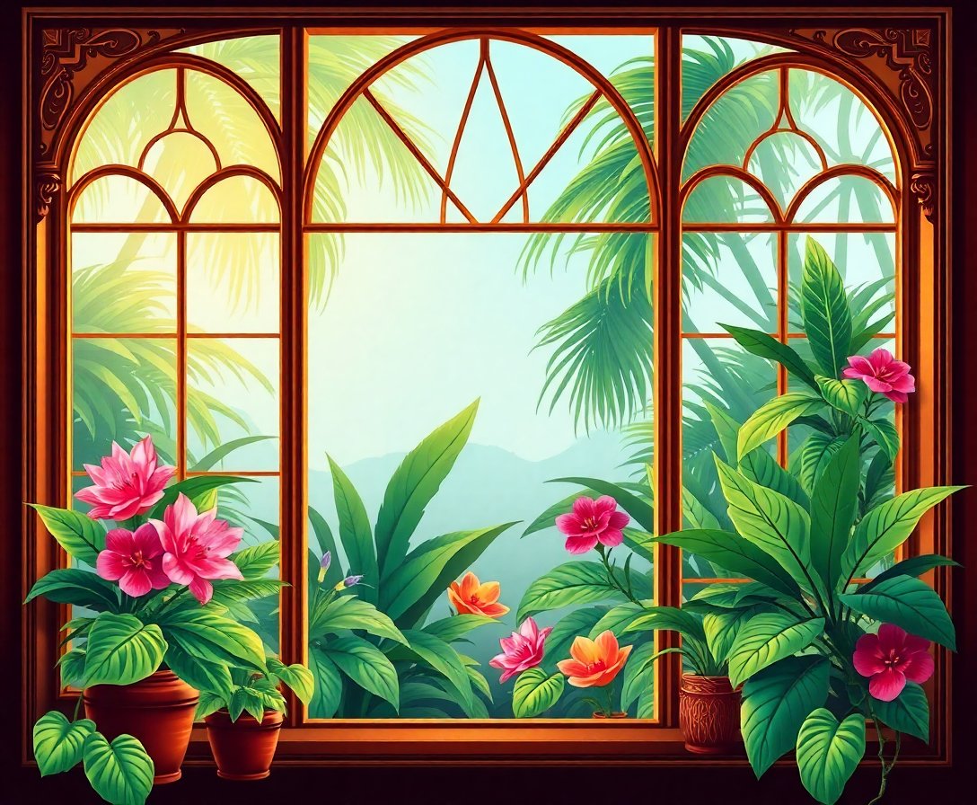Transform your space with this enchanting Brass Optics Tropical Window Paint By Numbers kit. This stunning design captures the warm elegance of Victorian-era interiors. Meanwhile, tropical views peek through ornate brass window frames. Your artistic journey begins with this captivating scene.
