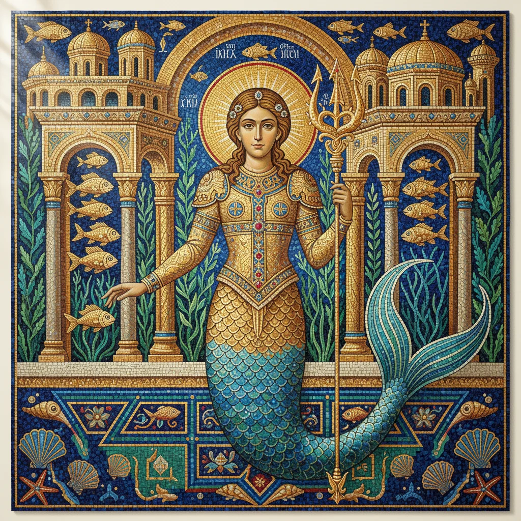 This artwork combines traditional Byzantine golden mosaic elements with oceanic mermaid themes, creating a unique fusion of ancient artistry and mythological beauty perfect for sophisticated home decor.