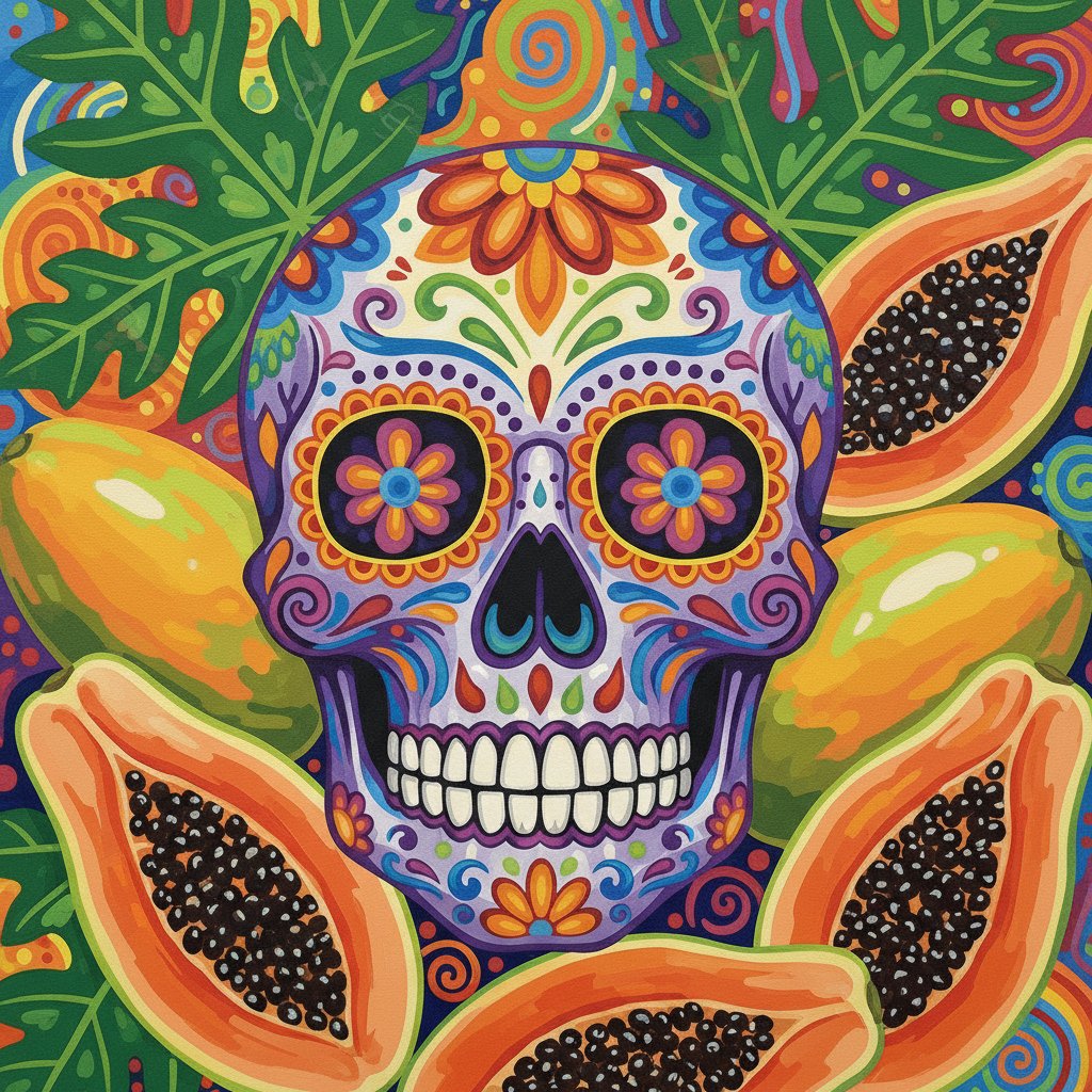 Transform your artistic journey with this stunning Calavera Amidst Ripe Papaya Paint By Numbers masterpiece. This captivating design celebrates DÃa de los Muertos heritage while showcasing vibrant tropical fruits. Moreover, the intricate skull artwork creates a meaningful connection to cultural traditions.