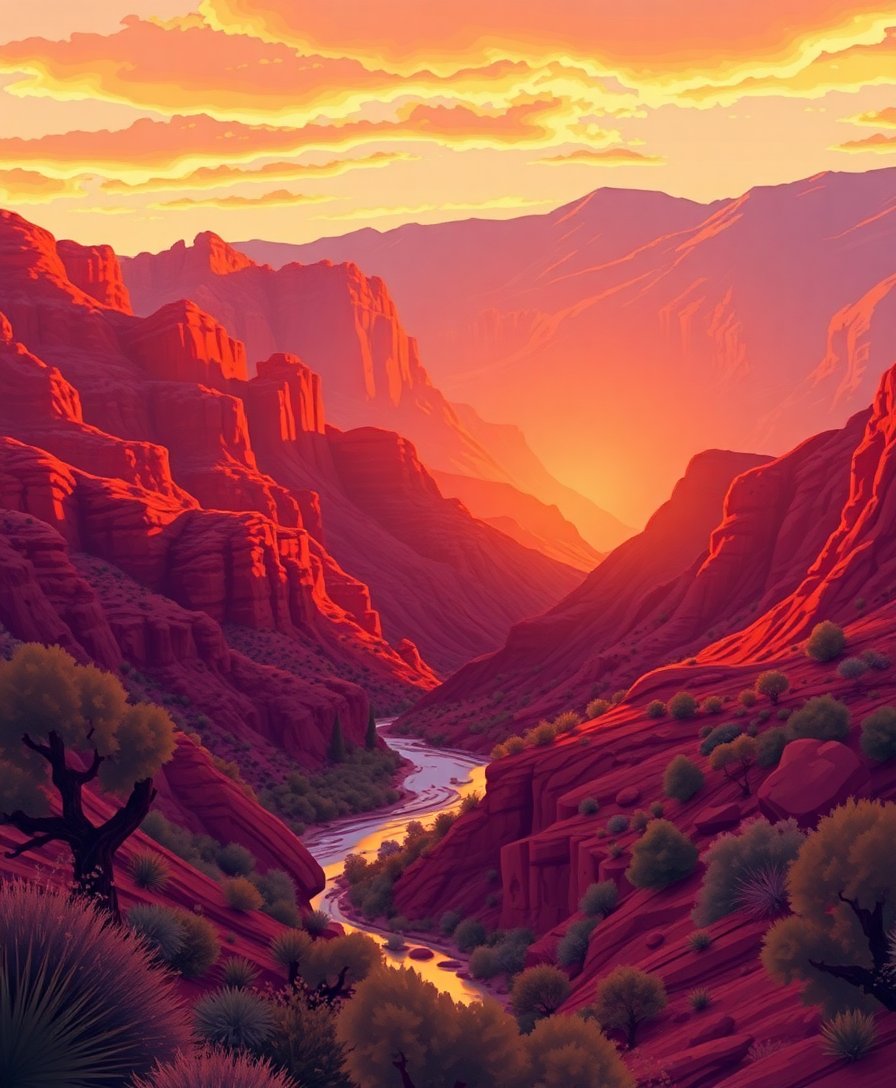 Ultimately, add the finishing touches to the water reflections and canyon details. Consequently, your masterpiece reveals the stunning landscape in all its glory. Finally, step back and admire your completed desert sanctuary that captures nature’s golden warmth.