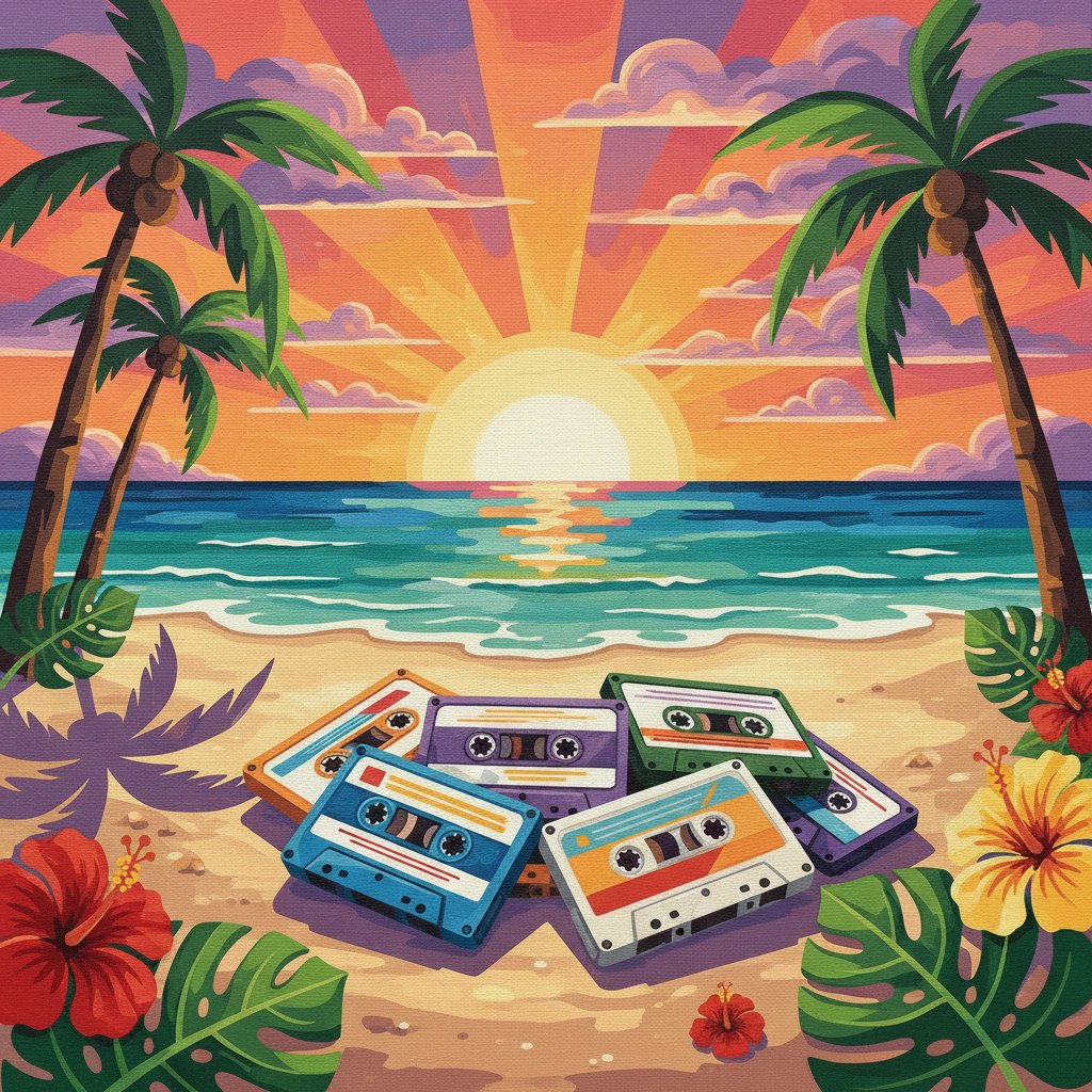 Ultimately, step back and admire your finished tropical paradise. The vibrant sunlight and realistic cassette details create an authentic 80s beach atmosphere. Your completed artwork becomes a stunning conversation piece.