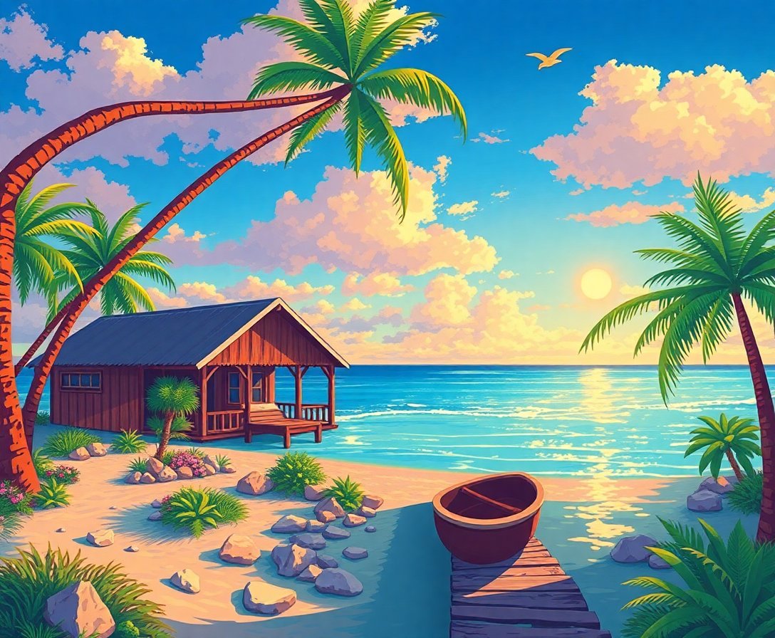 Experience the joy of creating your own coastal sanctuary. Additionally, this rustic tropical cabin scene brings vacation vibes home. Therefore, start your artistic journey today and discover newfound creative confidence.