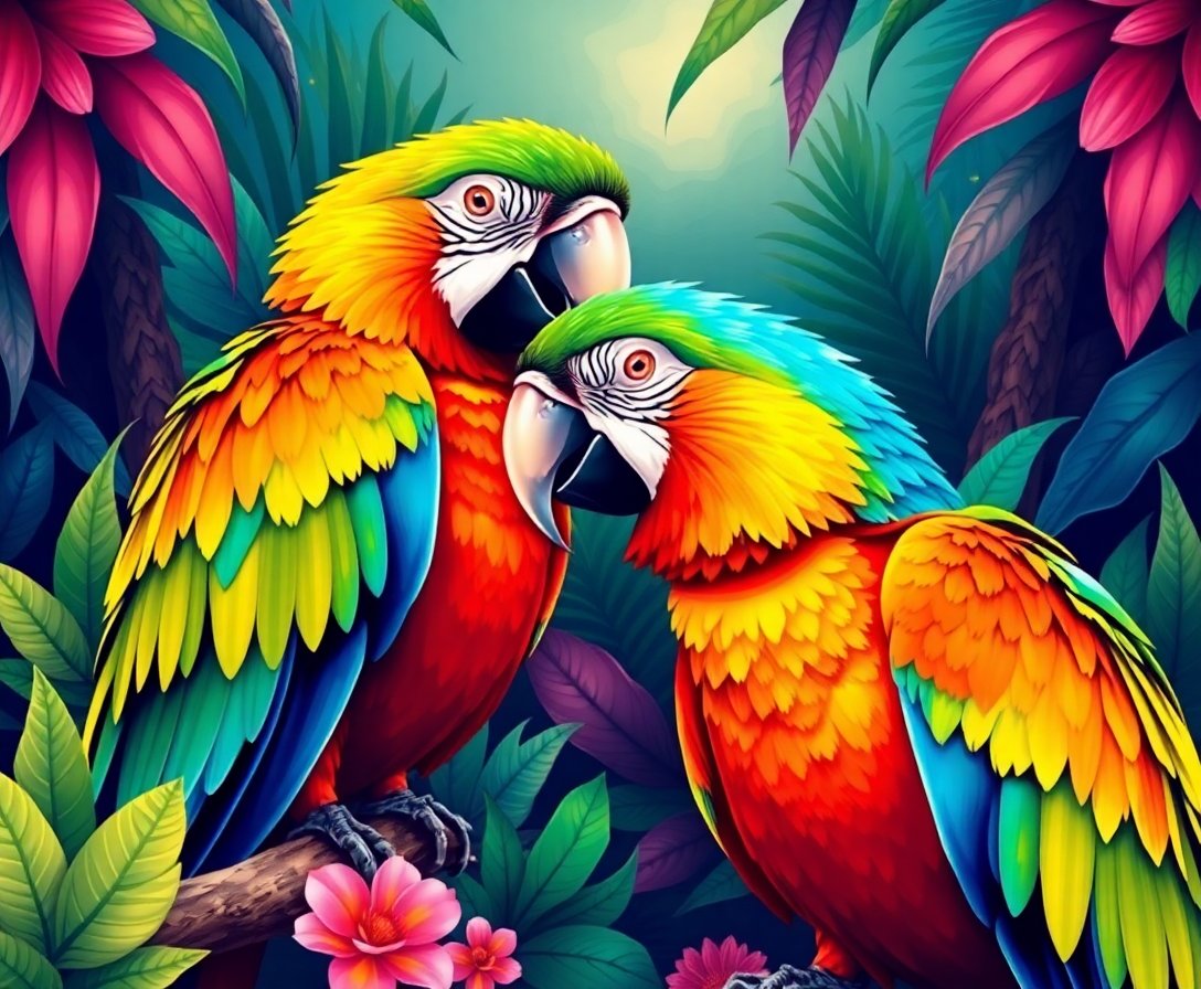 Transform your space with the stunning Celestial Jungle Macaw Duo Paint By Numbers, where tropical paradise meets cosmic wonder. This extraordinary design features two magnificent macaws surrounded by lush jungle foliage and mystical celestial elements.