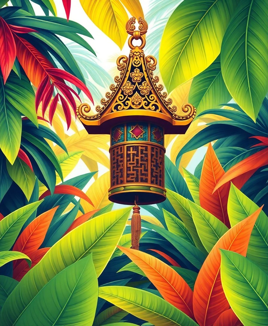 Ultimately, step back and admire your completed tropical sanctuary. The gentle chime surrounded by vibrant greenery creates a stunning focal point. Your finished piece radiates the tranquil essence of Southeast Asian Temples art.