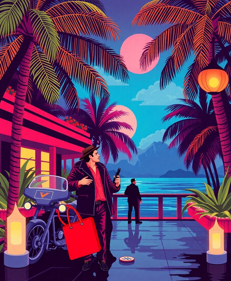 Transform your artistic space with this captivating Cinematic Tropical Night Heist Paint By Numbers masterpiece. This stunning kit brings together the glamour of vintage cinema with tropical mystique. Each brushstroke reveals a thrilling narrative of shadows and intrigue.