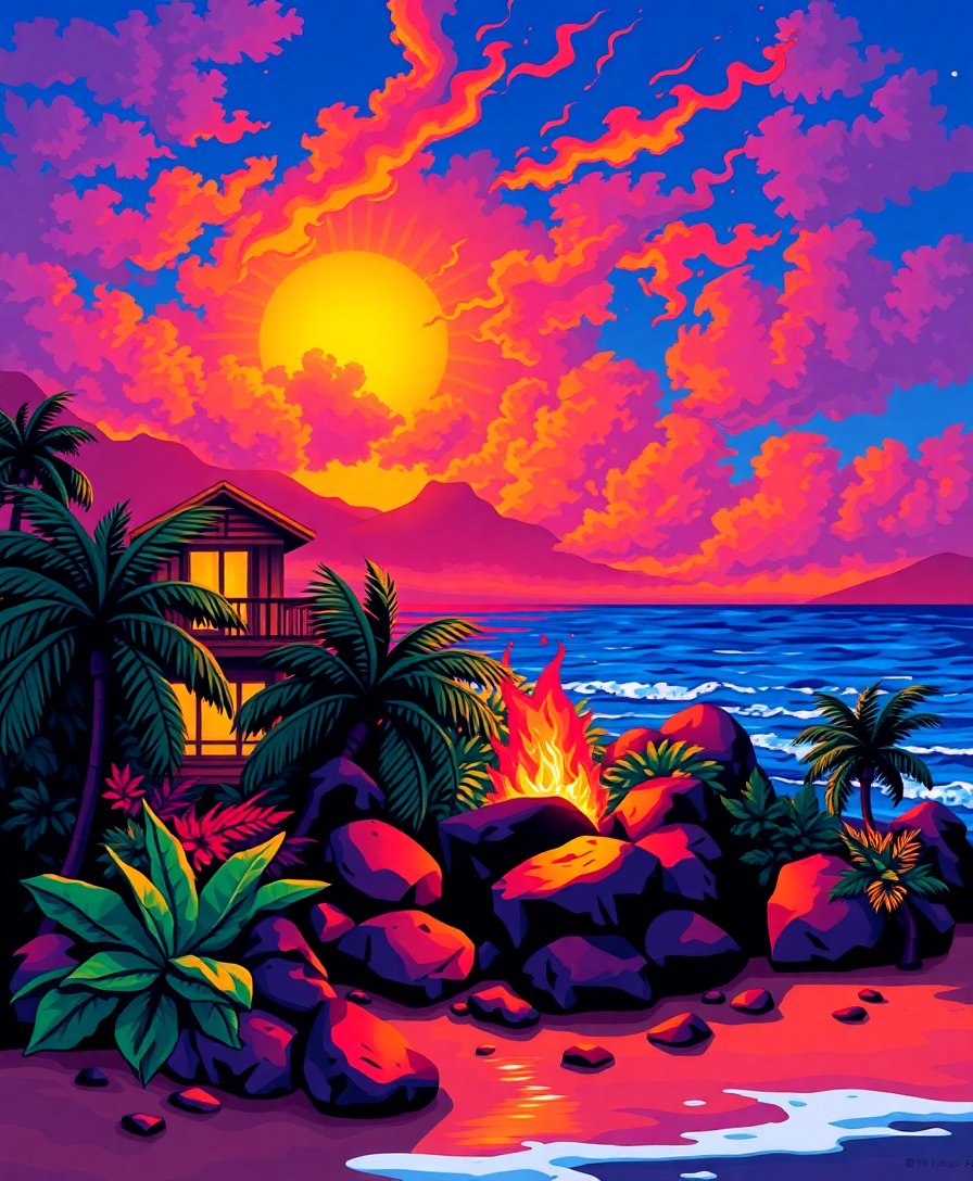 Ultimately, add final touches to enhance the bonfire’s luminous warmth. Finally, step back and admire your completed Hawaiian night scene. Consequently, prepare to display your stunning vintage-inspired creation.