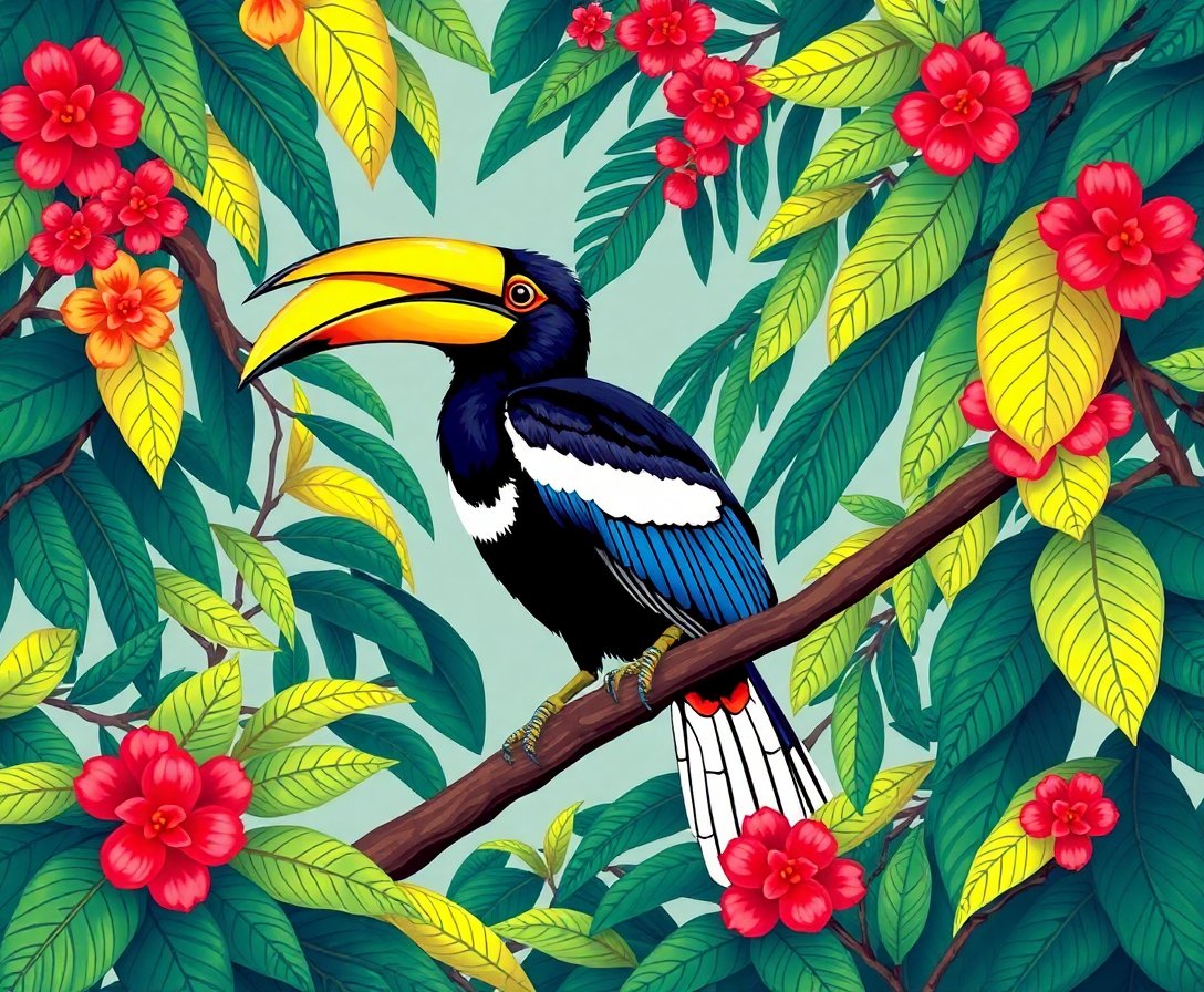 Ultimately, refine the hornbills, beaks, and eyes with patient strokes. Highlights bring the birds to life. As the canopy fills, depth appears and the scene feels almost cinematic. When the last number is covered, step back and admire your creative masterpiece. Finally, hang it where you can revisit that tranquil treetop atmosphere each day.