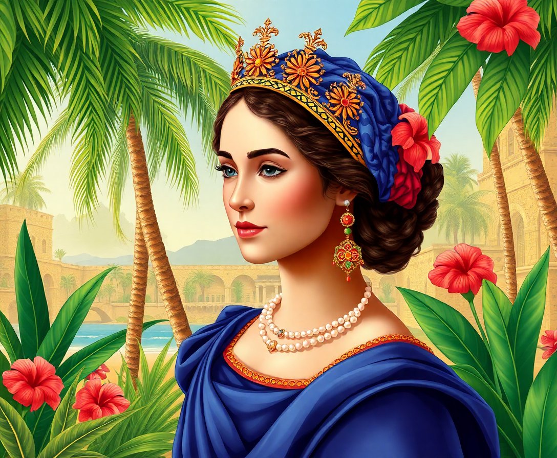 The unique combination of Renaissance portraiture style with tropical oasis elements creates a sophisticated yet exotic artwork. The cultural and historical themes add depth and meaning to your finished piece.