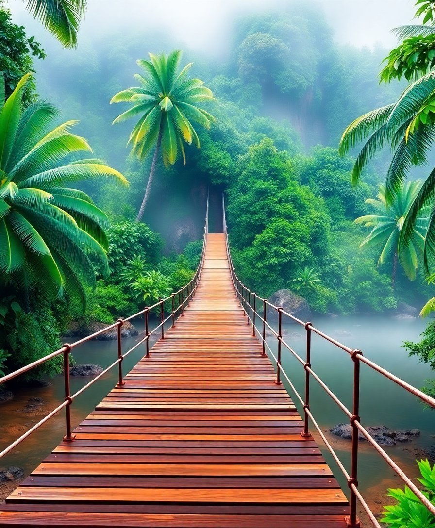 The tropical mist effect creates beautiful depth and mystery, while the architectural bridge elements provide satisfying structural details to paint. This combination offers both artistic challenge and visual appeal.