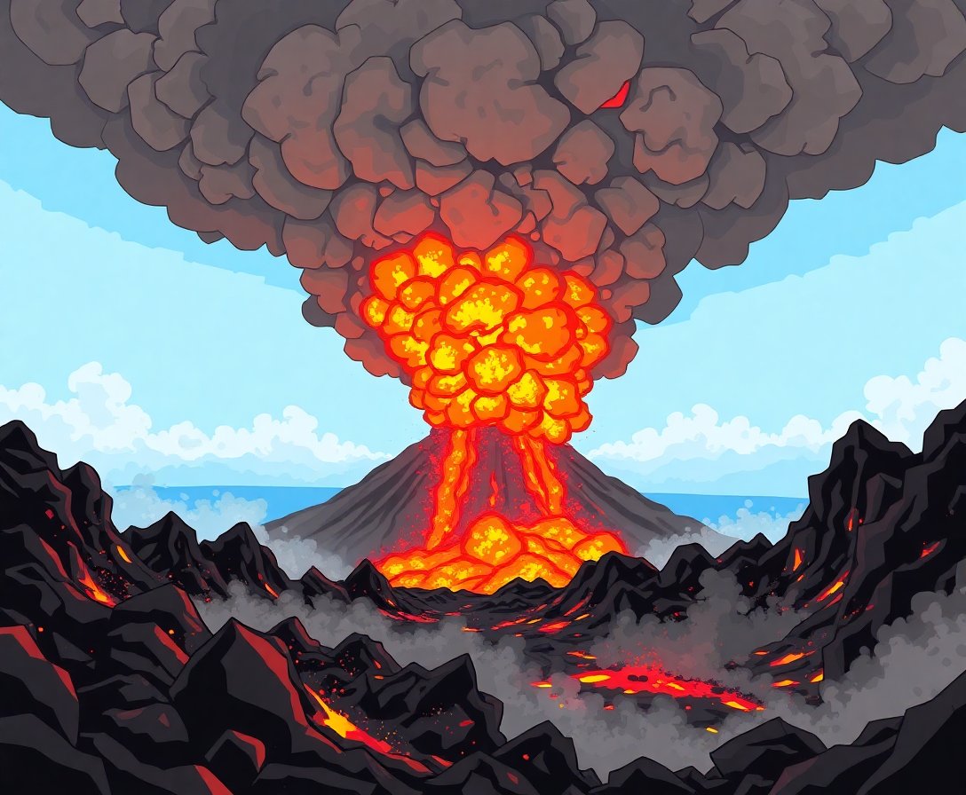 Ultimately, step back and admire your completed masterpiece. The dramatic contrast between serene ocean waters and explosive volcanic ash creates stunning visual impact.