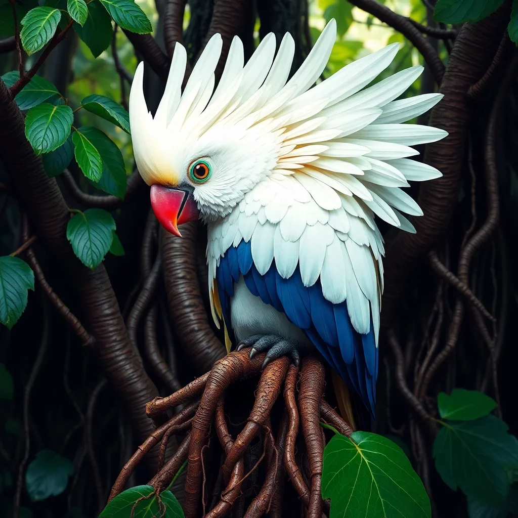 The canvas measures 16×20 inches, providing ample space to showcase the cockatoo’s magnificent plumage and the complex strangler root system in beautiful detail.