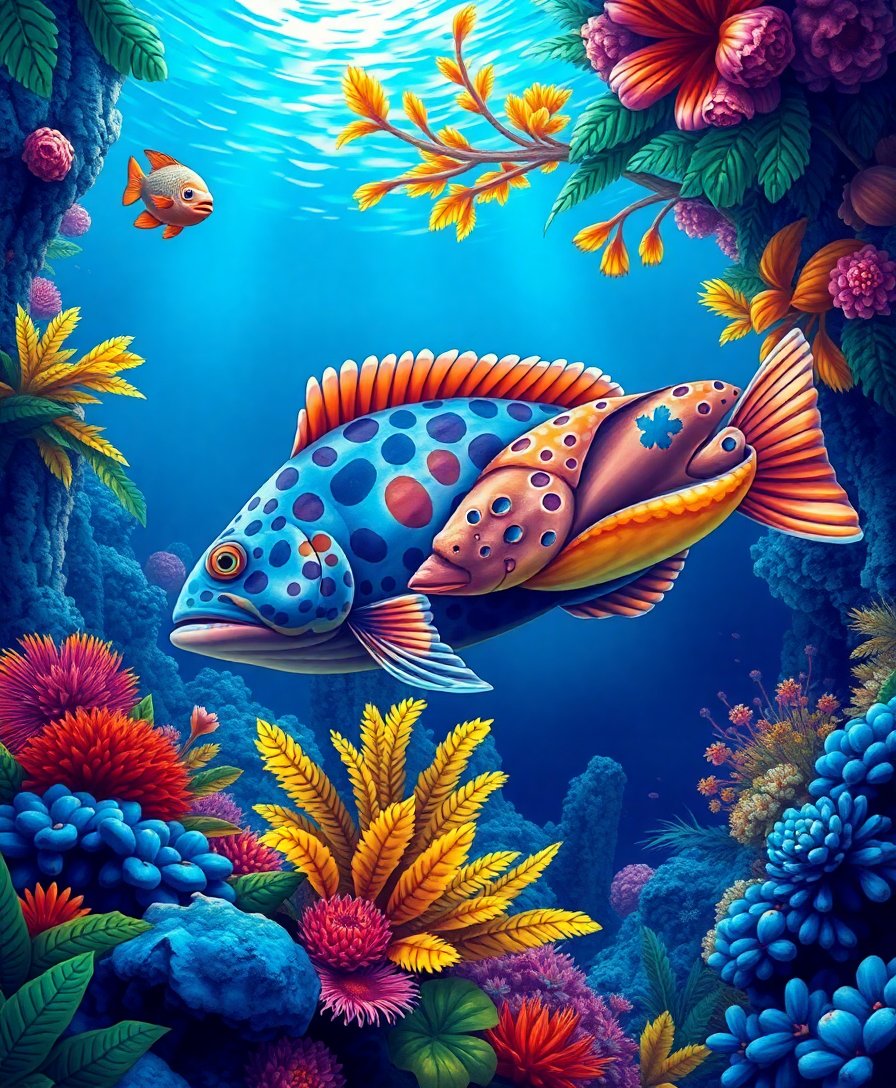 The coelacanth represents a living fossil, making this artwork both educational and visually striking. The tropical abyss setting with indigo water creates stunning contrast perfect for any space.