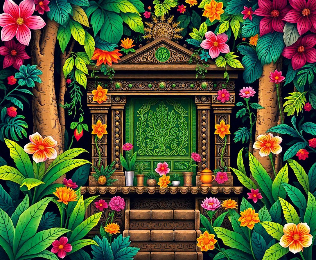 Ultimately, add final touches to smaller details and vibrant heliconia blooms. Step back and admire your completed archaeological masterpiece. Your ancient Maya altar now radiates with jungle beauty.