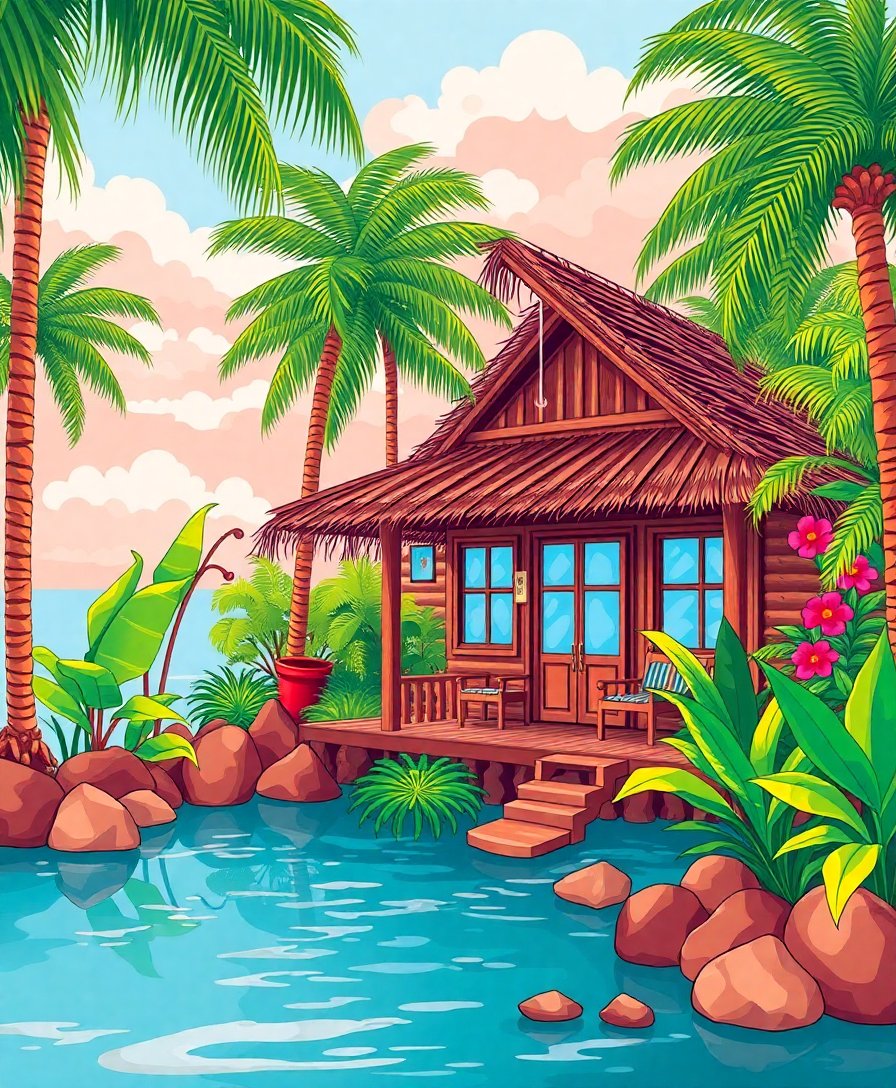 Transform your space with this enchanting Cozy Tropical Cabin Retreat Paint By Numbers design. This captivating kit brings the serene beauty of a rustic hideaway surrounded by lush vegetation directly to your canvas. Experience the perfect blend of tropical paradise and cozy comfort through this detailed artistic journey.