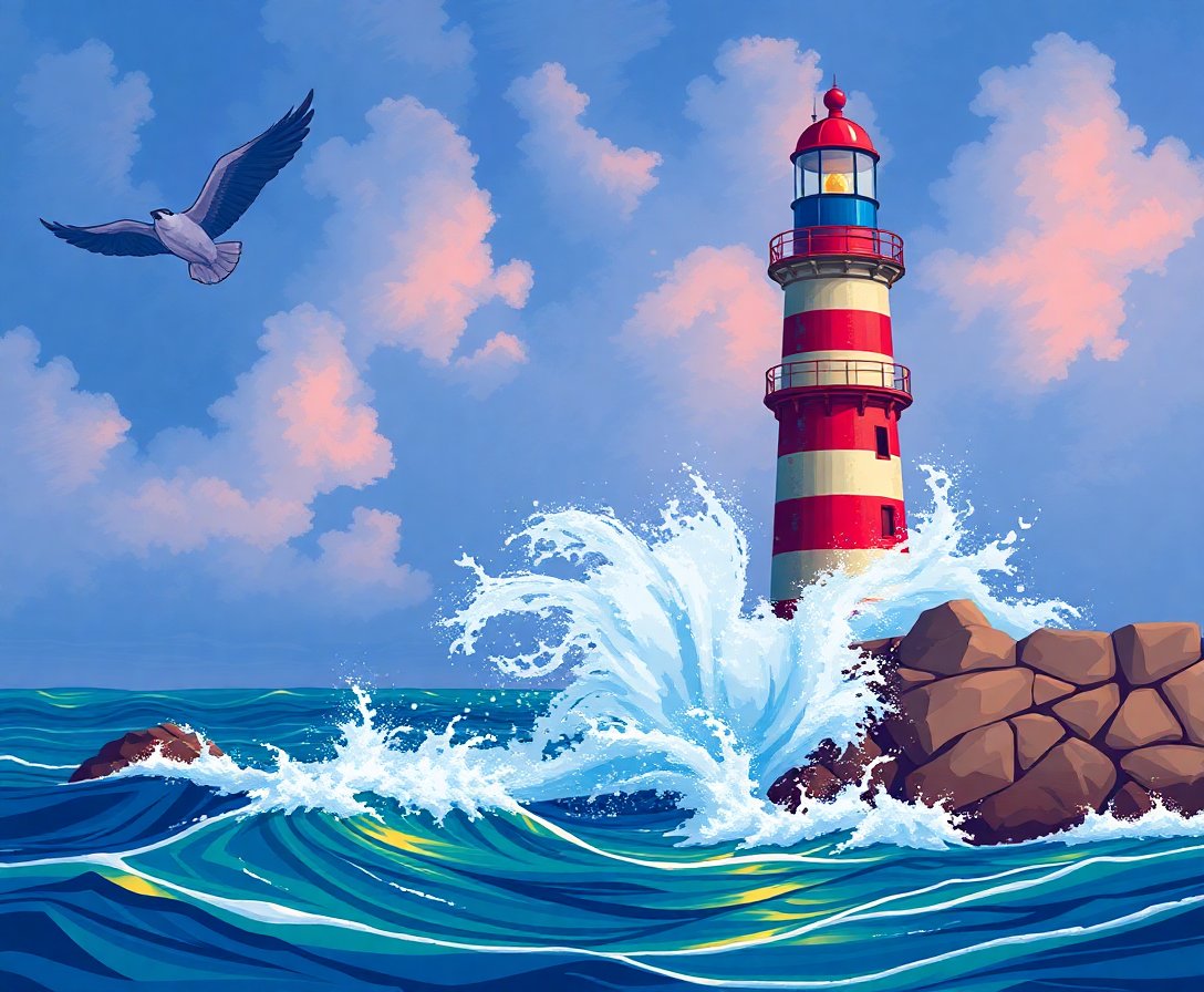 Ultimately, step back and admire your completed coastal masterpiece. The final touches bring together the foam-capped waves, weathered lighthouse, and turbulent sky. Your finished painting captures the essence of nature’s power and maritime history beautifully.